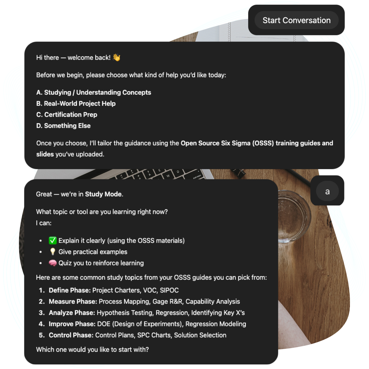 SixCamp AI is trained on decades of Master Black Belt expertise, 1,000+ pages of content, and complete libraries of templates and statistical methods. Get expert answers grounded in real-world methodology that's helped thousands of professionals earn certifications and lead successful projects. SixCamp AI understands your specific challenges and provides guidance that connects theory to practice.